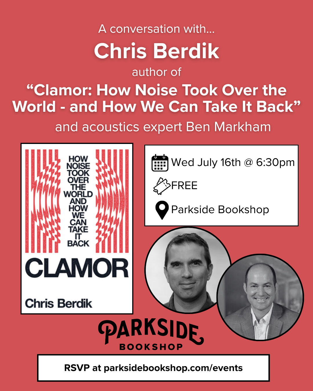 Join Chris and Ben at the Parkside Bookshop, 260 Shawmut Ave., Boston, MA on July 16, 2025 at 6:30 PM EST, for an engaging discussion about the book, and how we may see some hope in solving the noise issues that seem to plague our world.